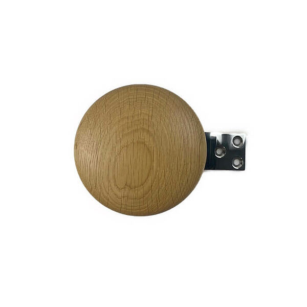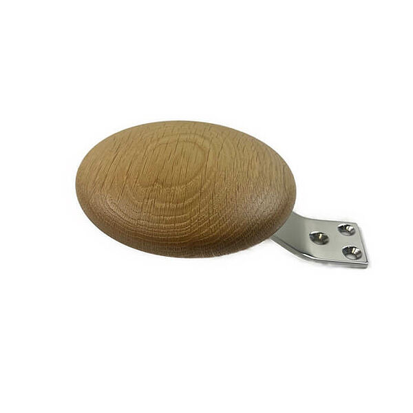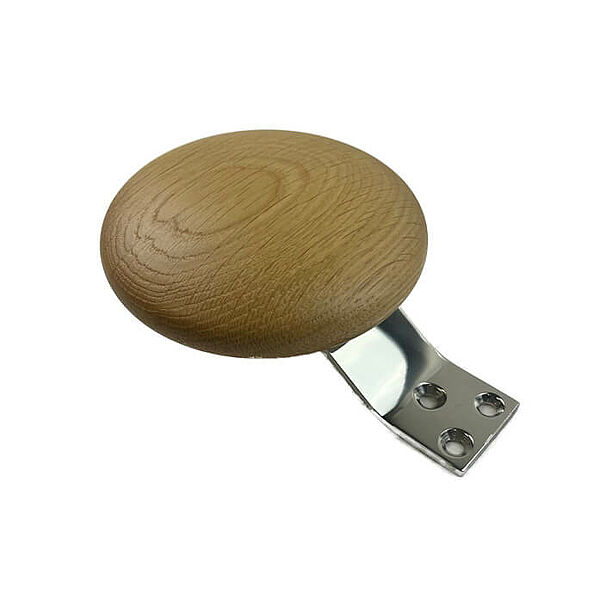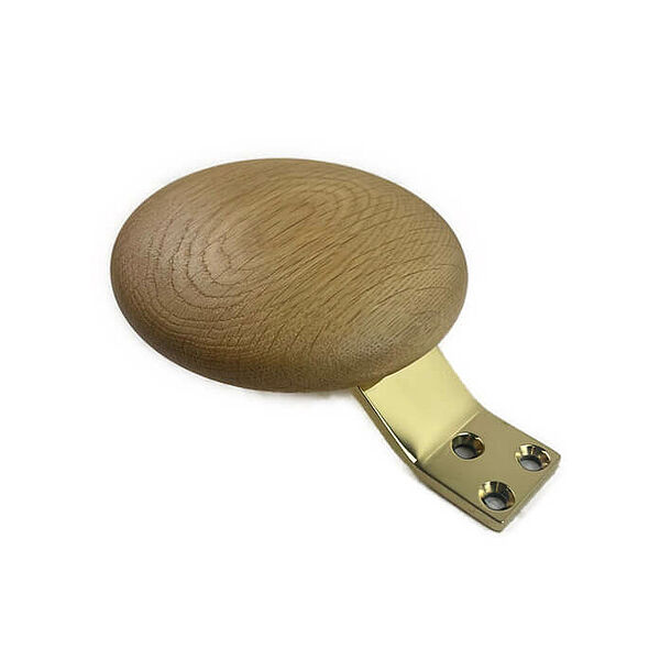 Ett handtag med välvd tryckplatta. Standard i lackerad ek med rostfritt eller mässingsfäste. Kan beställas med olika träslag och ytbehandlingar. Ange dörrtjocklek vid beställning.