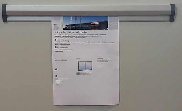 Anslagslisten håller papper på plats med hjul. Pappret kan enkelt sättas dit och tas bort utan att det ramlar av.