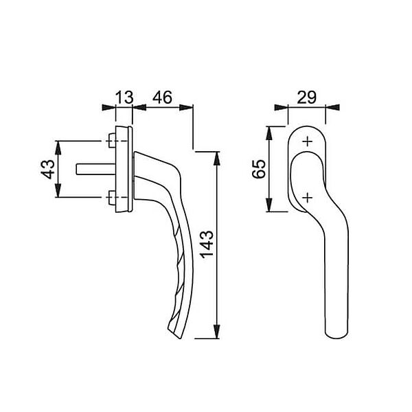 Spanjoletthandtag höger oval Aluminium Silvereloxerad /b=29 Sprint 8/43mm.